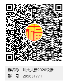 申请人请加入“川大文新2020级推免硕士”QQ群(群号:295631771, 也可扫描以下二维码进入),该群需实名认证,认证方式是“姓名+所在学校”。