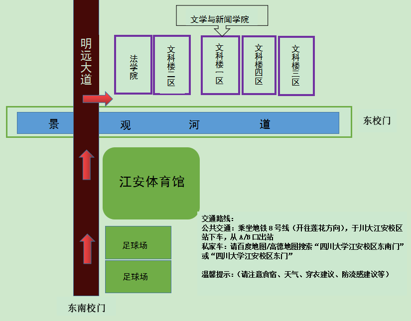 校外考生可乘坐成都地铁8号线在川大江安校区站下车,从A口或B口出站,到达w88win中文手机版江安校区东南门;也可乘坐私家车导航至w88win中文手机版江安校区东门或w88win中文手机版江安校区东南门(车辆不入校)。