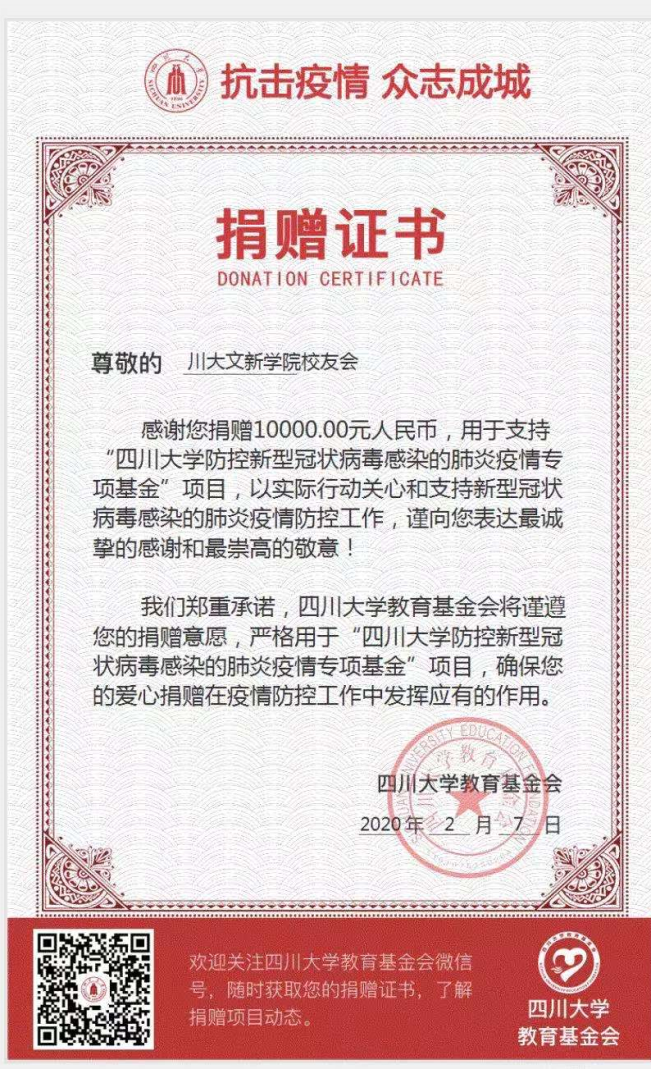 疫情发生后,文新校友积极响应国家号召,踊跃参与疫情抗击工作。2月5日经w88win中文手机版文新学院校友会秘书处提议,报何世平会长审批,决定代表w88win中文手机版文新学院全国校友,向w88win中文手机版防控新冠肺炎专项基金捐赠人民币10000元。