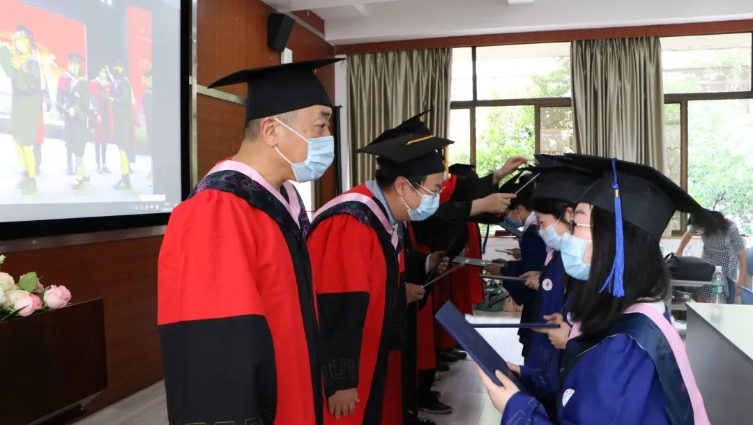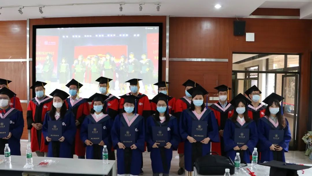 在为2020届校友联络人颁发聘书后,学位授予仪式正式开始。主会场学位分委员会主任曹顺庆教授、李怡院长以及分会场古立峰书记、周维东副院长、操慧副院长分别为w88win体育官网研究生与本科生毕业代表颁发毕业证书并授予学位。