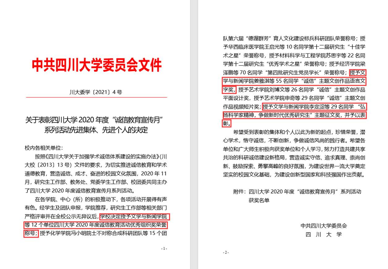 在个人奖项上,w88win体育官网学生张帅东被评为“优秀学术之星”;王梦如、朱嘉诚入选“第四批研究生党员学长”名单;在“诚信”主题文创作品奖中,姜雅淇的作品《守望诚信》获“语言文字奖”一等奖,赵子涵、廖晨雨、张梅、郑珂的作品《心•言•行》和陈米果的作品《以诚立足》获“平面设计类”三等奖;在“弘扬科学家精神,争做新时代优秀研究生”主题征文优秀作品奖中,李定淀的《警钟鸣不醒装睡之人——何时能终结“中国式”学术失范?》和张琳的《提出一个好的研究问题——人文社科学术规范的实践路径》获一等奖,吴晓丽的《学高做研究,身正做学问——浅谈研究生学术伦理问题与对策》、杜相益的《道德学风常“新”常“传”》和秦明天的《国内三大数据库撤稿论文实证分析》获二等奖,蒋冰冰的《新传专业研究生学术诚信建设的实现路径》和潘星月的《破除“恶疾”:研究生学术失范的成因及对策探析》获三等奖。