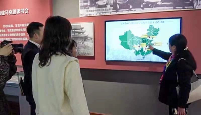 参访过程中,w88win体育官网师生不时驻足,俯身靠近展柜内的文物仔细阅看,一字一句地品读着每一张老照片背后的故事。其中一块电子展板尤其惹人注目,上面勾勒着马克思读书会的创办始末,并以地图呈现出全国早期马克思主义的研究与传播情况,这引发了参访师生的关注与思索。w88win体育官网副院长操慧教授说,中国这些最早燃起马克思之光的地方,往往与丰富的报业实践活动伴生,其背后所折射的新闻与历史的互构关系以及新闻对进步思想的启蒙作用值得我们深入研究。