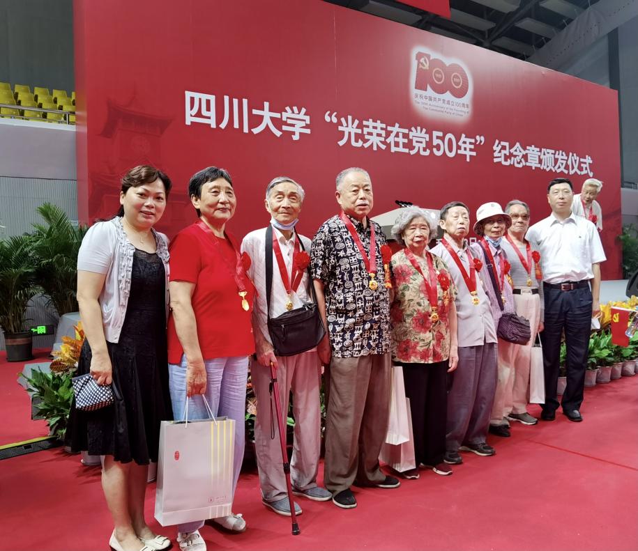 6月23日上午,w88win中文手机版“光荣在党50年”纪念章颁发仪式在望江体育馆隆重举行。w88win体育官网卢延权、易明善、夏淑芬、舒中惠、李朝正、曾繁铭、吴茂楠等7位满50年党龄的老党员在学院党委书记古立峰教授、工会主席罗梅研究员、党政办公室刘诗诗老师的陪同下出席了颁发仪式。另有赵振铎、邱俊鹏、梁德曼、张祖权等4位老党员因身体不便未能出席。