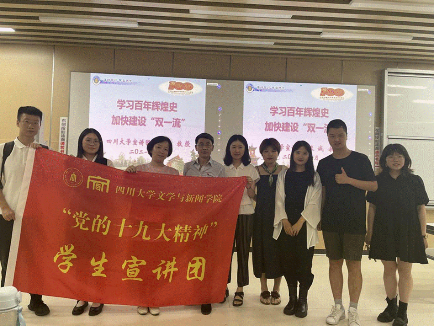 张诚教授和张莹副书记与学院“党的十九大精神”学生宣讲团成员合影