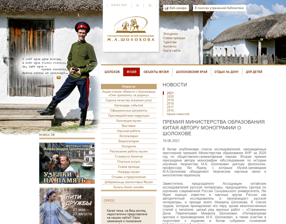 近日,俄罗斯国立肖洛霍夫故居博物院官网刊发题为《中国教育部授予肖洛霍夫研究者奖项》(ПремияМинистерстваобразованияКитаяавторумонографии о Шолохове)的新闻,详细介绍了w88win体育官网刘亚丁教授关于肖洛霍夫的研究成果及其与俄方学界的交流经历,对其学术工作的意义予以高度评价。