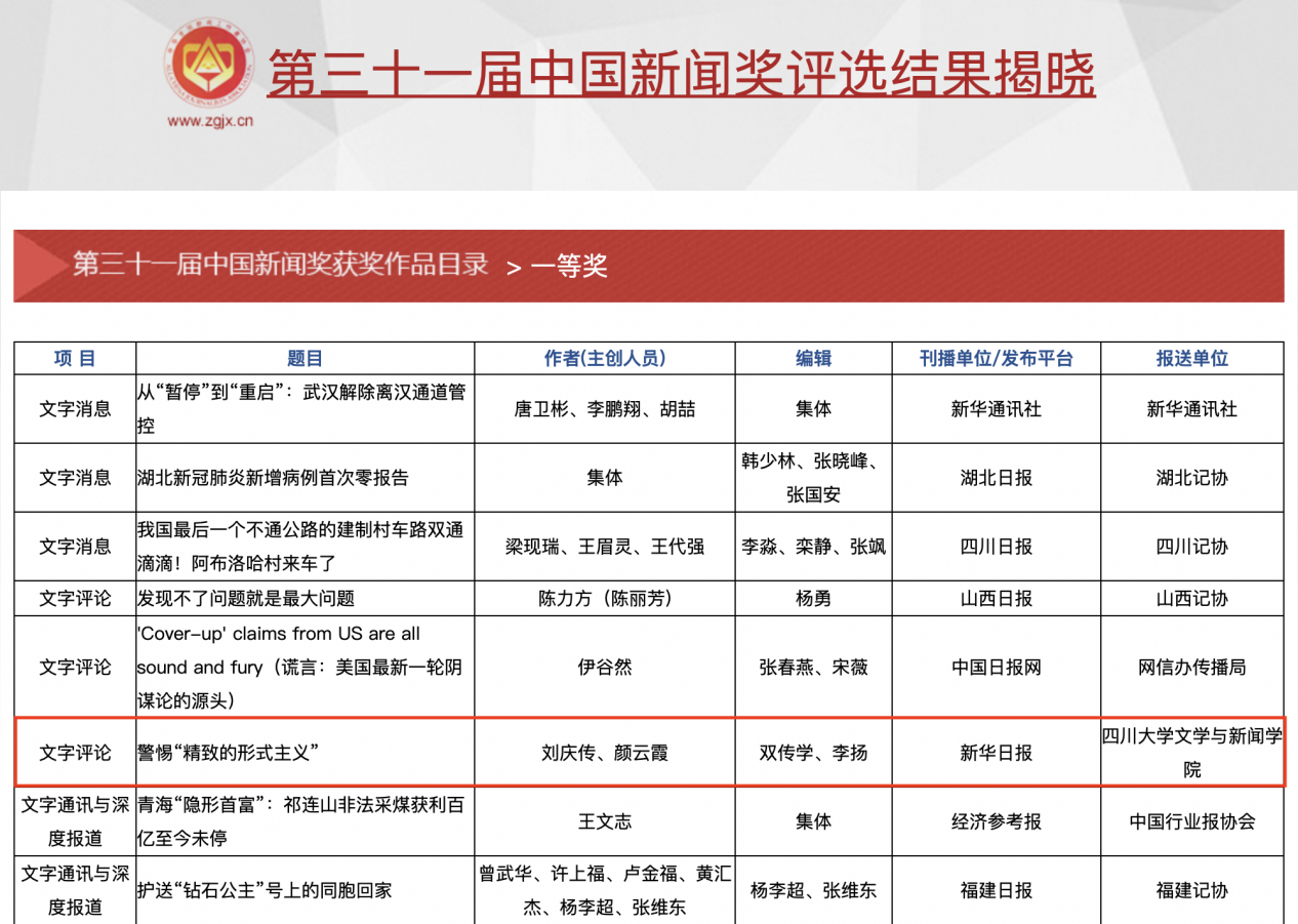 2021年11月7日,中华全国新闻工作者协会主办的第三十一届中国新闻奖评选结果揭晓,四川大学文学与新闻学院报送的新华日报作品《警惕“精致的形式主义”》喜获第三十一届中国新闻奖一等奖,是此届中国新闻奖一等奖中仅有的三篇文字评论之一。这是自2016年起担任试点报送单位以来,w88win体育官网初评推评的作品第五次荣获中国新闻奖。