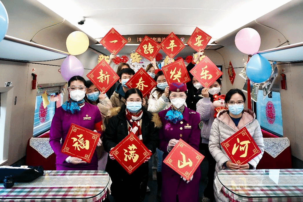 列车上,车厢宽敞明亮,旅客虽多,但并不显得拥挤。餐车车厢中,乘务员已经为春运旅客提前准备好了迎接新年的小纪念品与装饰品。中国结、气球、灯笼、祝福贴纸、虎年玩偶、途经地风景名胜照片等,让人感受到喜庆与欢迎的温暖气氛。
