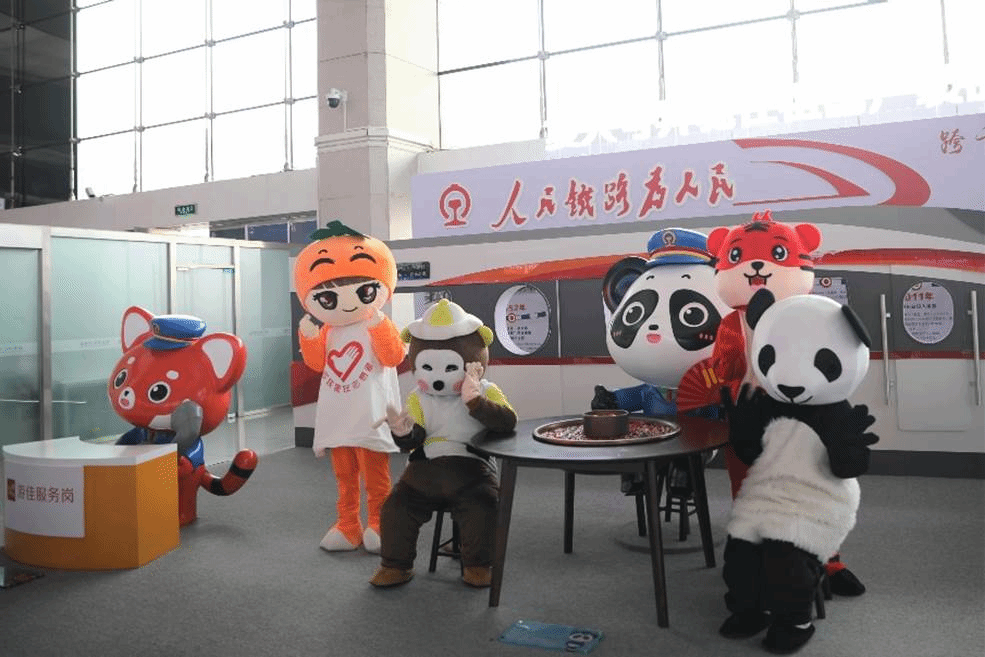 走出服务岗,师生们来到了车站里的一处打卡点。熊猫、老虎、猴子、小橙子玩偶扮相的工作人员围着一桌“火锅”,与来往旅客热情地打招呼。他们身后,一块名为“复兴号奔驰在祖国广袤的大地上”的巨幅展板,讲述着我国铁路的重大发展历程。据车站负责人介绍,此处是东客站为春运旅客特设的“复兴号打卡点”,在这里,旅客们既可以了解我国铁路的成长故事,还能与富有地区特色及新年氛围的“玩偶”们互动玩乐。参与服务的工作人员龚怡说,打卡点的不少玩偶形象都是由铁路职工们亲手设计的,一到休班时段,大家就会来到此处,穿上可爱的玩偶服,在趣味的交际和互动中为旅客们送上新春见面礼,“就希望给大家带来不一样的感觉,让旅客们快乐地出行。”
