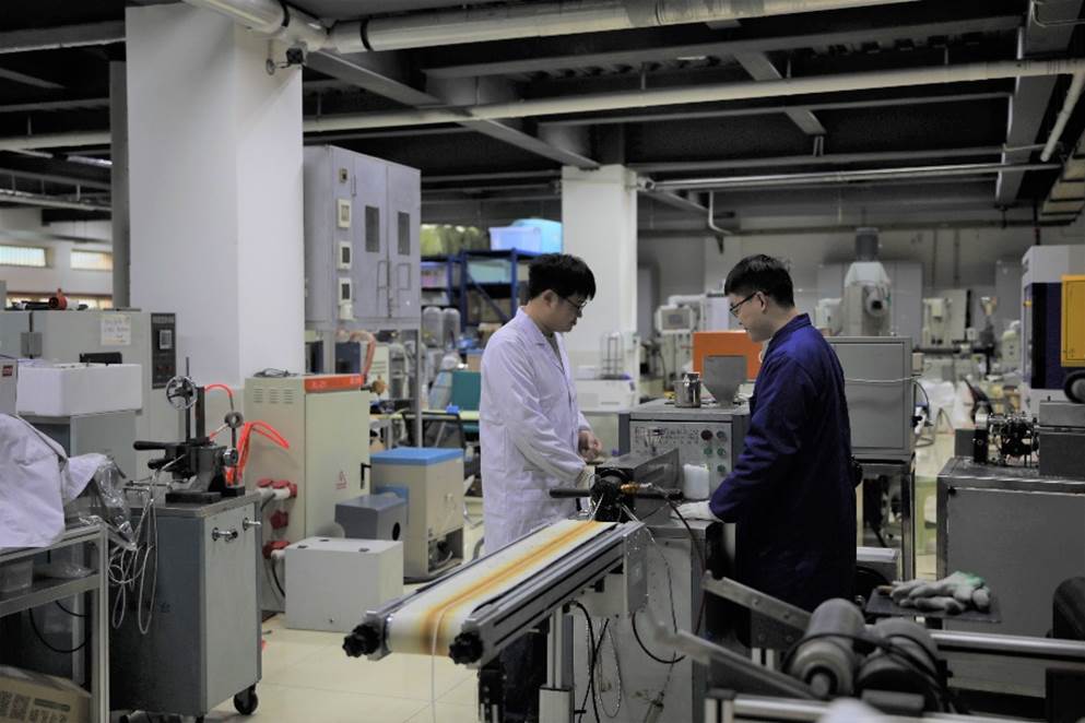 步入实验室,刚刚留校的专职博士后徐大伟正在与一位二年级博士生将白色颗粒倒入机器中,机器另一头的口模处同时缓慢地挤出塑料丝条。据介绍,他们正在进行聚乙烯醇的熔融挤出造粒实验,聚乙烯醇是一种环境友好塑料,却不具有热塑加工的性能,目前王琪院士团队在做的,就是解决聚乙烯醇热塑加工的难题,使环境友好塑料能够替代不可降解的材料,并投入大规模生产。
