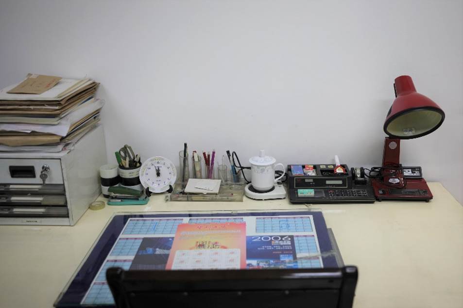 在高分子材料工程国家重点实验室的学科发展陈列室旁是“徐僖院士纪念室”,在此纪念室的内侧依旧保留着他生前使用的办公室。房间不大,一套办公桌、两张沙发、一张茶几与几个书柜摆放紧凑,所见最多的是相关的工具书和资料文件。办公桌玻璃板的下方,垫有《塑料工业》期刊印发的日历,时间停在2012年。