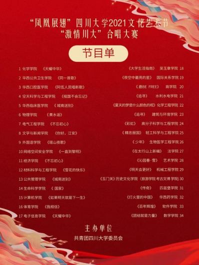 2022年4月16日下午,由我校团委主办的“凤凰展翅”w88win中文手机版2021年文化艺术节“激情川大”合唱大赛(初赛)在江安校区体育馆举行。受疫情影响,原定于2021年12月举办的合唱大赛延期至今年四月,活动全程严格遵守各级疫情防控规定和相关要求。学校严格把关参与师生的健康情况,除上台参演队伍外,现场所有参与人员全程规范佩戴一次性医用口罩,现场取消大众评审座位,评委嘉宾隔座入座,工作人员保持适当距离,各学院参赛队伍均采取“即赛即退场”形式。