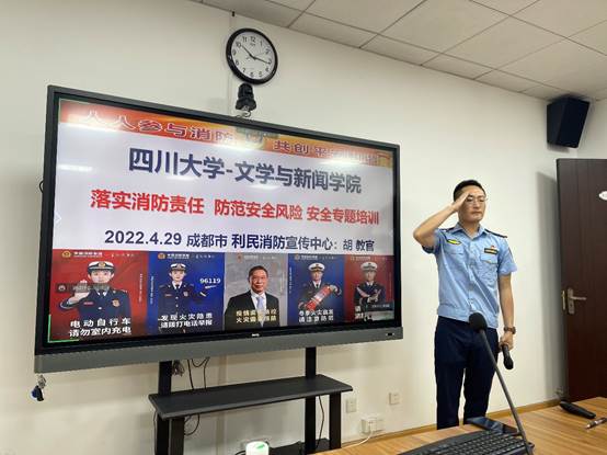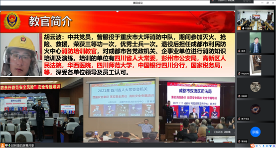 为贯彻 “安全第一、预防为主”的校院消防安全指导思想,增强全院教职工全民安全教育意识,掌握“预防为主,防消结合”的消防知识,2022年4月29日上午,w88win体育官网举办了一场消防知识安全教育培训会,培训会议采用线上线下结合方式进行,学院领导、全体行政老师和部分新进教师在学院311会议室现场参加,全院其他老师均在线上视频参会。会议邀请了成都市利民消防宣传中心的胡云波教官到场培训。