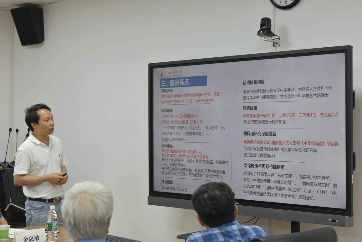 学科群联络人曾元祥代表学科群首席专家,简要汇报了学科群首轮建设成效、亮点及经验:学科群基本完成了首轮建设周期的目标任务,多数指标超额完成了预期目标。汇报了学科群第二轮建设规划及落实方案,简要说明了学科群第二轮建设落实方案编制情况:保持与首轮方案的有效衔接,围绕学科内涵建设、中华文化传承与全球传播,强化具有显示度的标志性成果的建设倾斜。