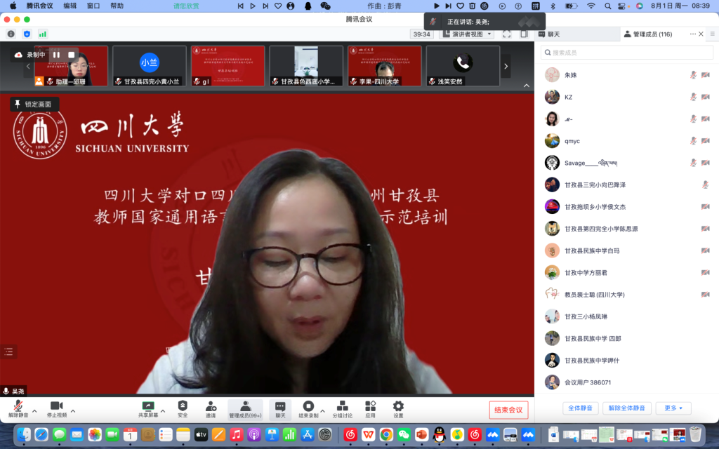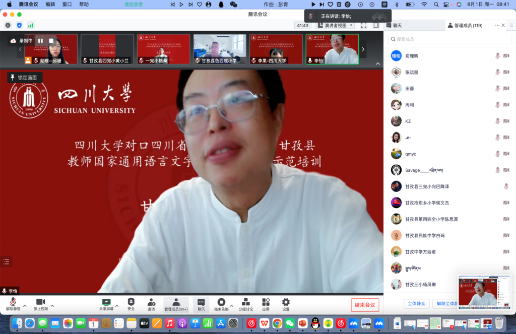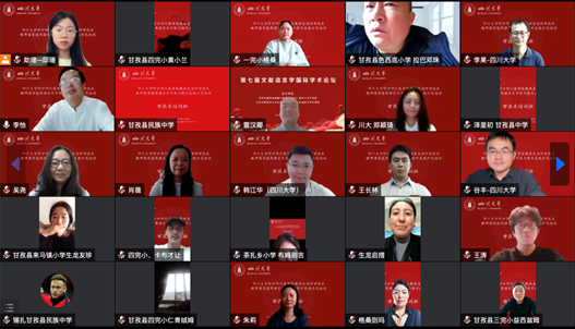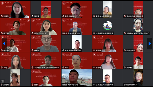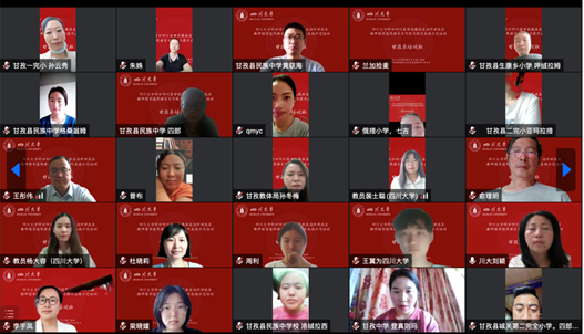 为深入贯彻党的十九大和十九届历次全会精神,落实全国语言文字会议和教育部党组关于教育脱贫攻坚成果同乡村振兴有效衔接的工作部署,2022年8月1日上午8点30分,w88win中文手机版国家语言文字推广基地对口四川省甘孜藏族自治州甘孜县教师国家通用语言文字能力提升在线示范培训举行了线上开班典礼。出席此次典礼的嘉宾有我校人事处处长、国家语言文字推广基地常务副主任、语言文字工作委员会办公室主任吴尧教授,语言文字工作委员会办公室副主任朱莉老师,w88win体育官网院长李怡教授,我校国家语言文字推广基地执行主任雷汉卿教授,甘孜县教育和体育局股长孙冬梅,我校人事处副处长王彤伟教授等14位专家教师、20位学生教员及全体参训学员。开班典礼由w88win体育官网院长李怡教授主持。