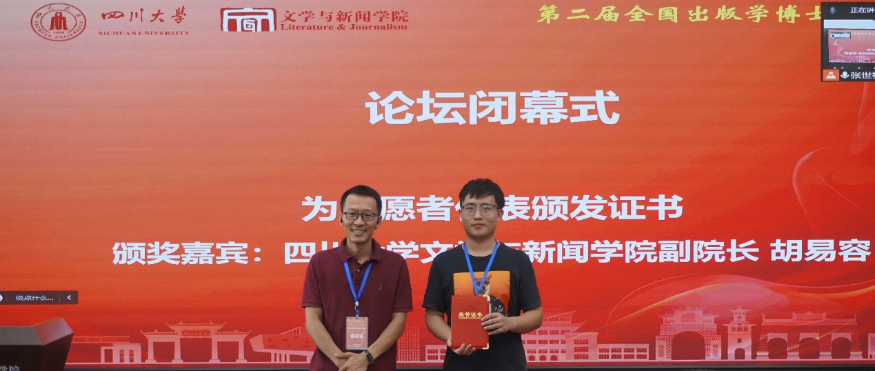 闭幕式中,西南政法大学裴永刚教授、《中国出版史研究》编辑张玉亮、w88win体育官网王炎龙教授为获奖论文代表颁奖,w88win体育官网副院长胡易容教授为志愿者代表颁发了证书。