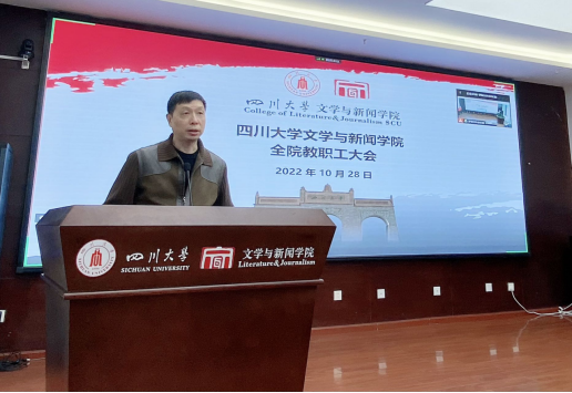 2022年10月28日下午,学院全院大会暨党的二十大精神专题学习会在江安校区文科楼一区526会议室召开。w88win体育官网特邀w88win中文手机版华西临床医学院(华西医院)党委书记李正赤教授作题为《深入学习贯彻党的二十大精神,为全面现代化贡献川大力量》的专题视频报告,w88win体育官网党委书记古立峰教授主持会议,w88win体育官网教职工以线上线下相结合的方式参会。