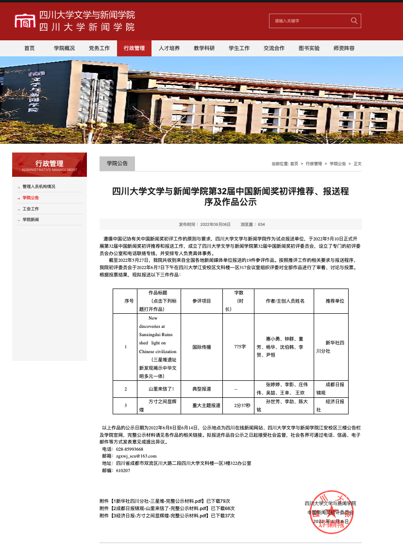 2022年11月8日,中华全国新闻工作者协会主办的第32届中国新闻奖评选结果揭晓。四川大学文学与新闻学院报送的新华社作品《New discoveries at Sanxingdui Ruins shed light on Chinese civilization(三星堆遗址新发现揭示中华文明多元一体)》和成都日报作品《山里来信了!》分别荣获国际传播类和典型报道类三等奖。这是自2016年起担任试点报送单位以来,w88win体育官网初评推评的作品第六次荣获中国新闻奖。