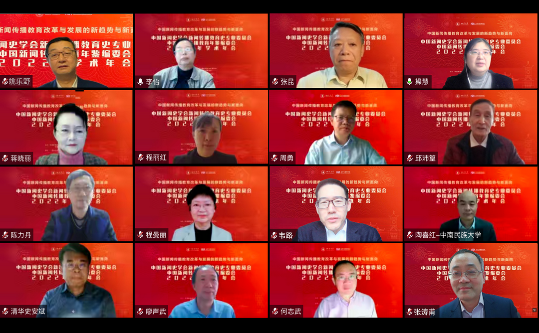 2022年11月12日,中国新闻史学会新闻传播教育史专业委员会、中国新闻传播教育年鉴编委会2022年学术年会在线成功举办。此次盛会汇聚了全国60多所新闻院校的300多位专家学者与在校学生。其中,大会主题报告与“院长论坛”共邀请到28位高校新闻传播学院的院长,“主编论坛”邀请到7位新闻传播领域重要学术期刊的主编、编辑部主任及责任编辑。