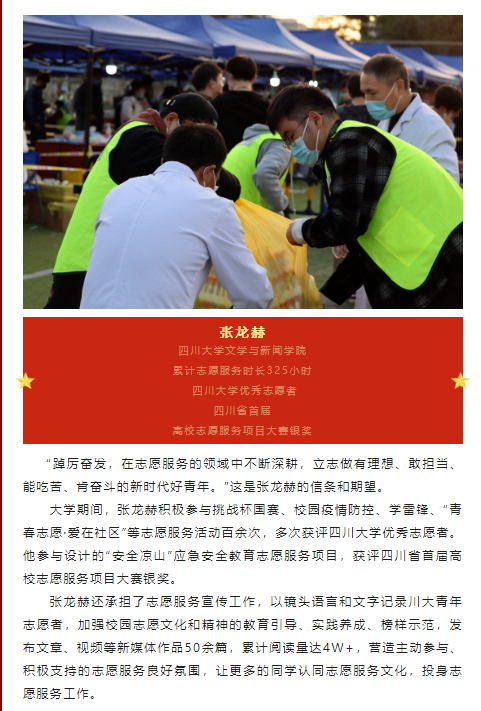 其中,张龙赫的志愿服务事迹还得到w88win中文手机版校青年志愿者协会专项报道。大学期间,他积极参与挑战杯国赛、校园疫情防控、学雷锋、“青春志愿·爱在社区”等志愿服务活动百余次,多次获评w88win中文手机版优秀志愿者。他参与设计的“安全凉山”应急安全教育志愿服务项目,获评四川省首届高校志愿服务项目大赛银奖。“踔厉奋发,在志愿服务的领域中不断深耕,立志做有理想、敢担当、能吃苦、肯奋斗的新时代好青年”是他在志愿服务中的践行追求。