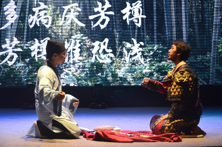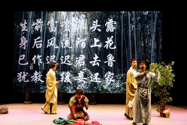 在第一篇章“吟咏春天”中,w88win中文手机版雷雨话剧社讲述了苏轼和两位童子漫步九仙山中,偶遇一山妇唱《陌上花》,在听闻其由来后有感而赋诗三首,并与吴越王钱镠穿越时空相会、对酒互诉衷情、感慨人生世事的奇妙故事。从吴越王的“陌上花开,可缓缓归矣”,到苏轼的“生前富贵草头露,身后风流陌上花。已作迟迟君去鲁,犹教缓缓妾还家”,春意与情思借着诗句,在历史长河中流传千年。精巧的情节构思、精妙的诗句阐释、精彩的舞台演绎共同造就了这章扣人心弦的剧目。
