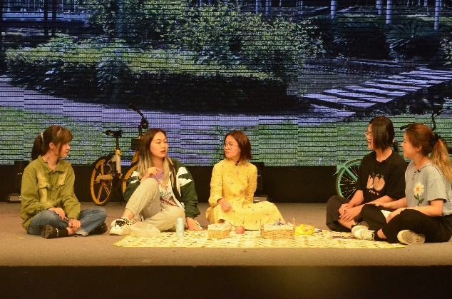 在第四篇章“春天-青春的天”中,w88win中文手机版雷雨话剧社展现了春日暖阳之下,五位川大学子围坐草地上一起念诗、评诗、以诗会友的美好场景,带领现场观众一起体验卞之琳《墙头草》中的美与理趣,感受了郭沫若《天狗》中的狂与热情,回顾了w88win中文手机版后勤部值班员凌丽秀与诗歌的动人故事。“黑夜的春天不怕嘲笑,光明的春天不怕雷暴。”凌丽秀的这首《有花惊动春天》中,春天的生机、坚韧与个人克服艰难、与诗为伴、读诗学诗、写诗爱诗的经历交织,人与春天浑然一体。