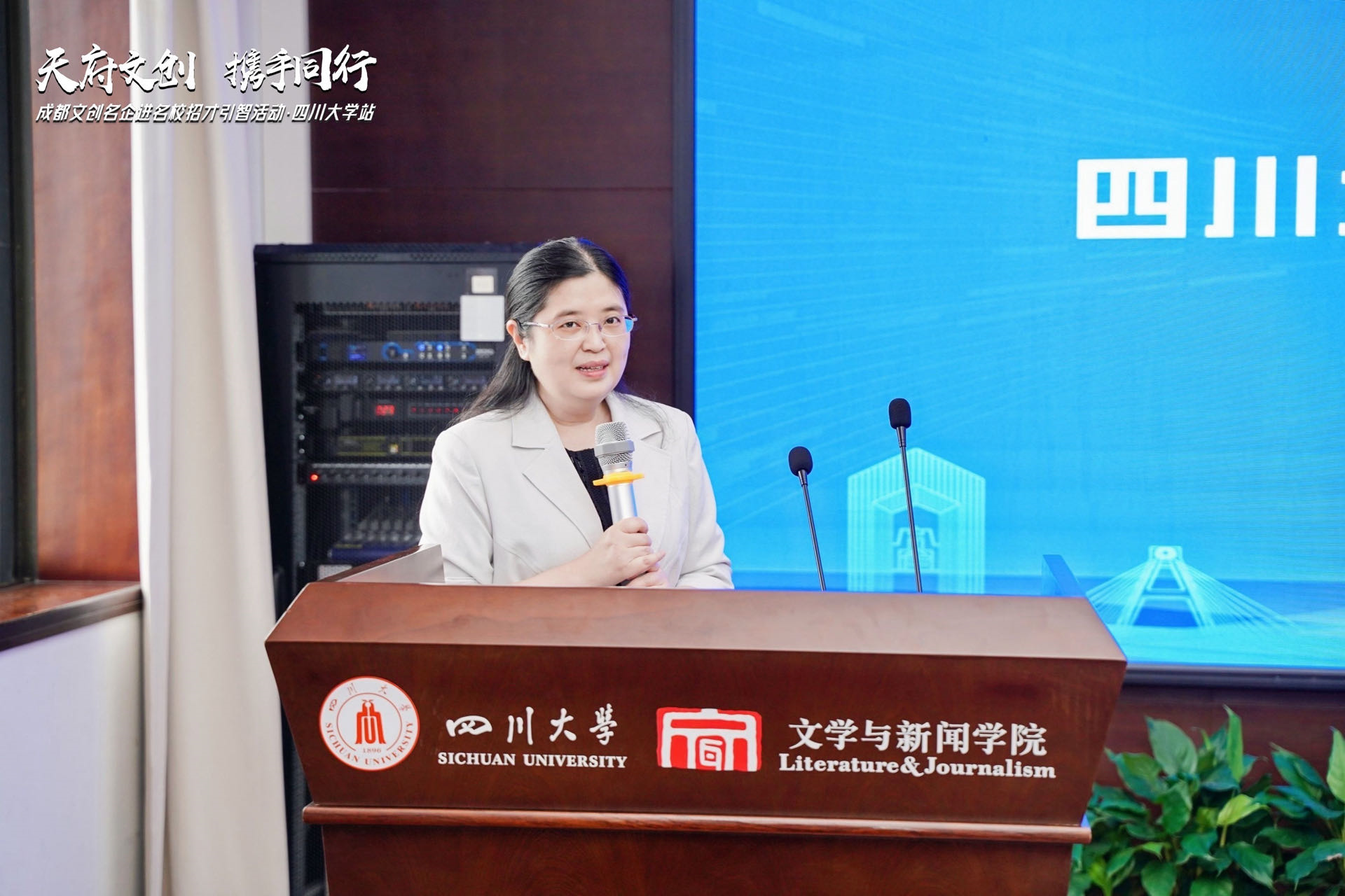 为贯穿实施人才引领发展战略,开展校企合作对接,促进学生创业就业,2023年6月2日,“天府文创 携手同行”成都文创名企进名校招才引智活动·w88win中文手机版站在江安校区文科楼一区举行。本次活动由中共成都市委宣传部指导,成都市文化产业发展促进中心、w88win体育官网联合主办。成都市委宣传部与市文促中心相关领导和十余家企业代表参加了本次活动。w88win中文手机版参加本次活动的有:w88win中文手机版教育电视台台长蔚钰、w88win中文手机版就业指导中心副主任杨梅、w88win体育官网党委副书记银浩老师、副院长操慧教授、辅导员郑格老师和学生代表。高校、企业、校友三方就“人才培养、产学研合”话题展开深入交流与探讨。高校、企业、校友三方就“人才培养、产学研合”话题展开深入交流与探讨。