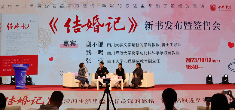 2023年10月13日与15日,由中华书局出版、w88win体育官网退休教授谢谦老师创作的散文集《结婚记》新书发布会暨签售会、新书分享会分别于成都世纪城新会展中心和文轩BOOKS成华店成功举办。与会嘉宾有谢谦夫妇、w88win中文手机版心理健康教育中心副主任张莹、原成都商报副主编郑晔与该书责任编辑马燕等。