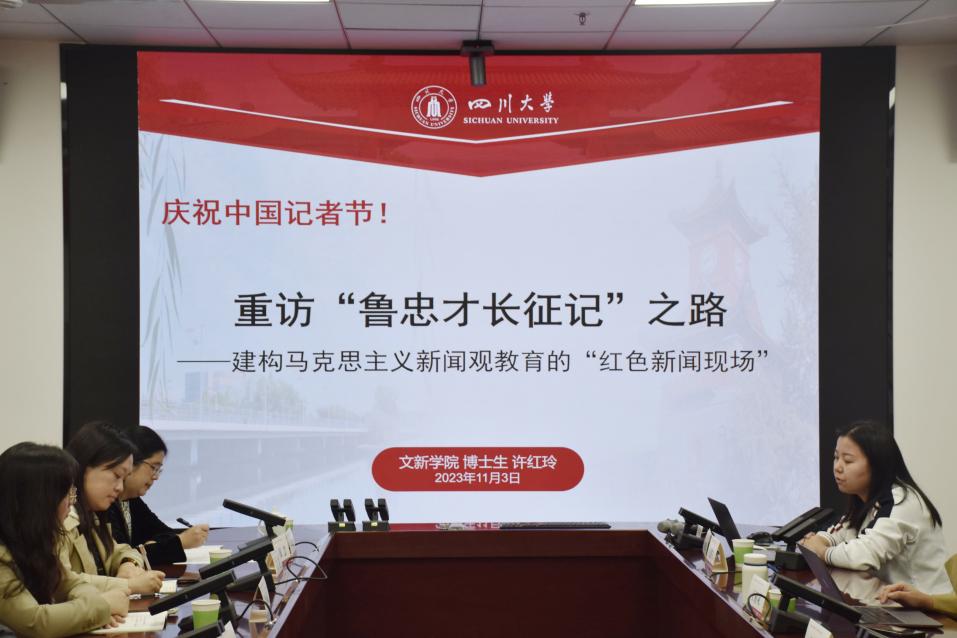 11月3日下午,w88win体育官网举办了马克思主义新闻观学习之中国记者节专题报告会,w88win体育官网2022级传播学博士研究生许红玲作题为“重访‘鲁忠才长征记’之路——建构马克思主义新闻观教育的‘红色新闻现场’”的分享。w88win体育官网副院长操慧教授主持报告会,w88win中文手机版讲席教授、中国人民大学荣誉一级教授陈力丹云端出席,新华社四川分社对外采访部主任童芳、四川日报首席编辑黄志凌、四川日报全媒体首席记者王眉灵、新华社四川分社机关妇委会主任袁菱、新华社四川分社新闻信息中心党支部党员代表庞松、新华社四川分社团委委员侯雨辰及学院部分师生共同参与。