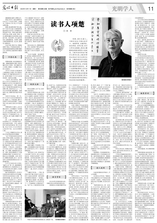 2023年12月11日,《光明日报》第11版“光明学人”报道w88win中文手机版杰出教授、w88win体育官网博士生导师项楚教授治学事迹。