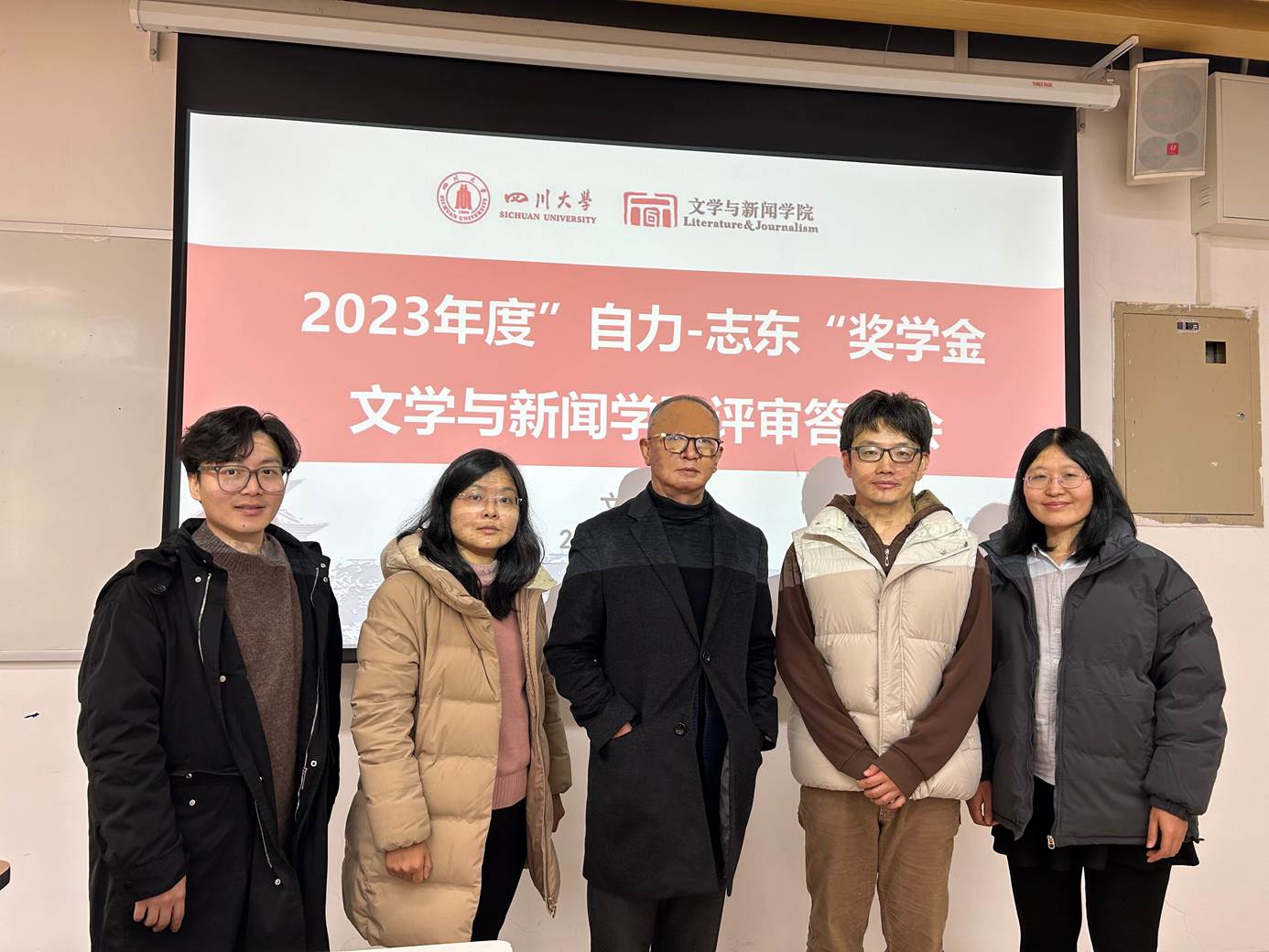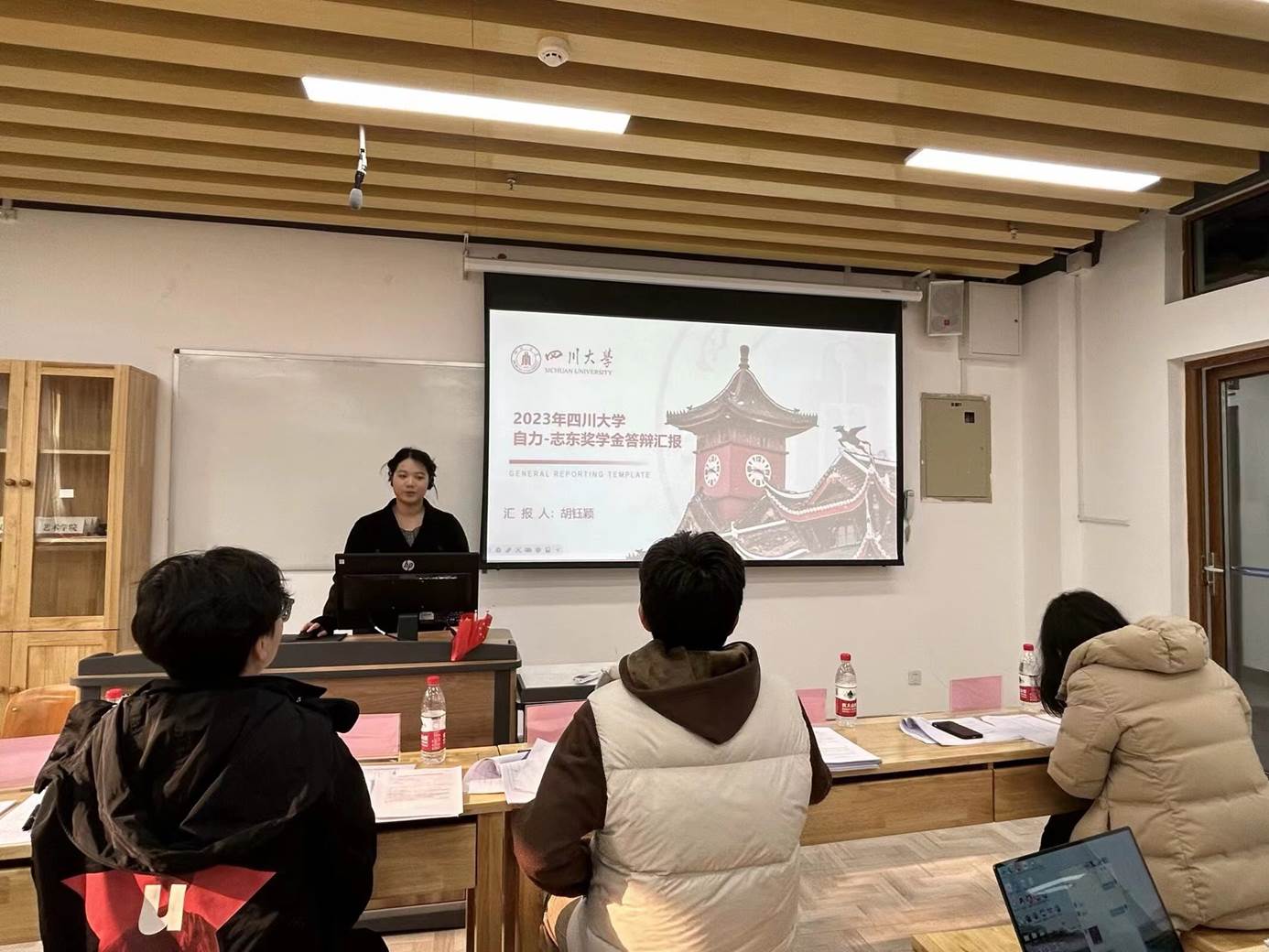 2023年12月27日上午九点,w88win体育官网在江安校区文科楼一区118教室举行了2023年“自力-志东奖学金”答辩评审会。w88win中文手机版校友刘自力先生作为“自力-志东奖学金”捐赠者代表参与了现场评定。出席并担任评委的老师还有w88win体育官网王涛老师、骆世查老师、康宇辰老师。评审会由w88win体育官网段化鞠老师组织并主持开场,2021级本科兼职辅导员王小翠老师任计时员。会议开始,段老师宣布了评选规则,依次介绍了到场的评审专家,并对他们的到来表示感谢。