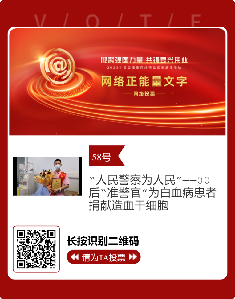 近日,由中央网信办主办的2023中国正能量网络精品征集展播活动正式启动网络展播投票。w88win体育官网报送的四川省红十字会作品《“人民警察为人民”——00后“准警官”为白血病患者捐献造血干细胞》成功入围终选,进入网络展播投票阶段,时间为2月27日至3月4日,投票结果将作为中国正能量网络精品终选的重要参考。