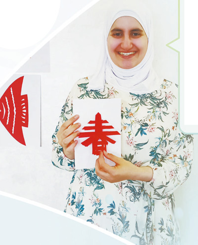 图为马纳尔·马吉迪·阿卜杜勒—拉蒂夫·哈马什展示剪纸作品。
