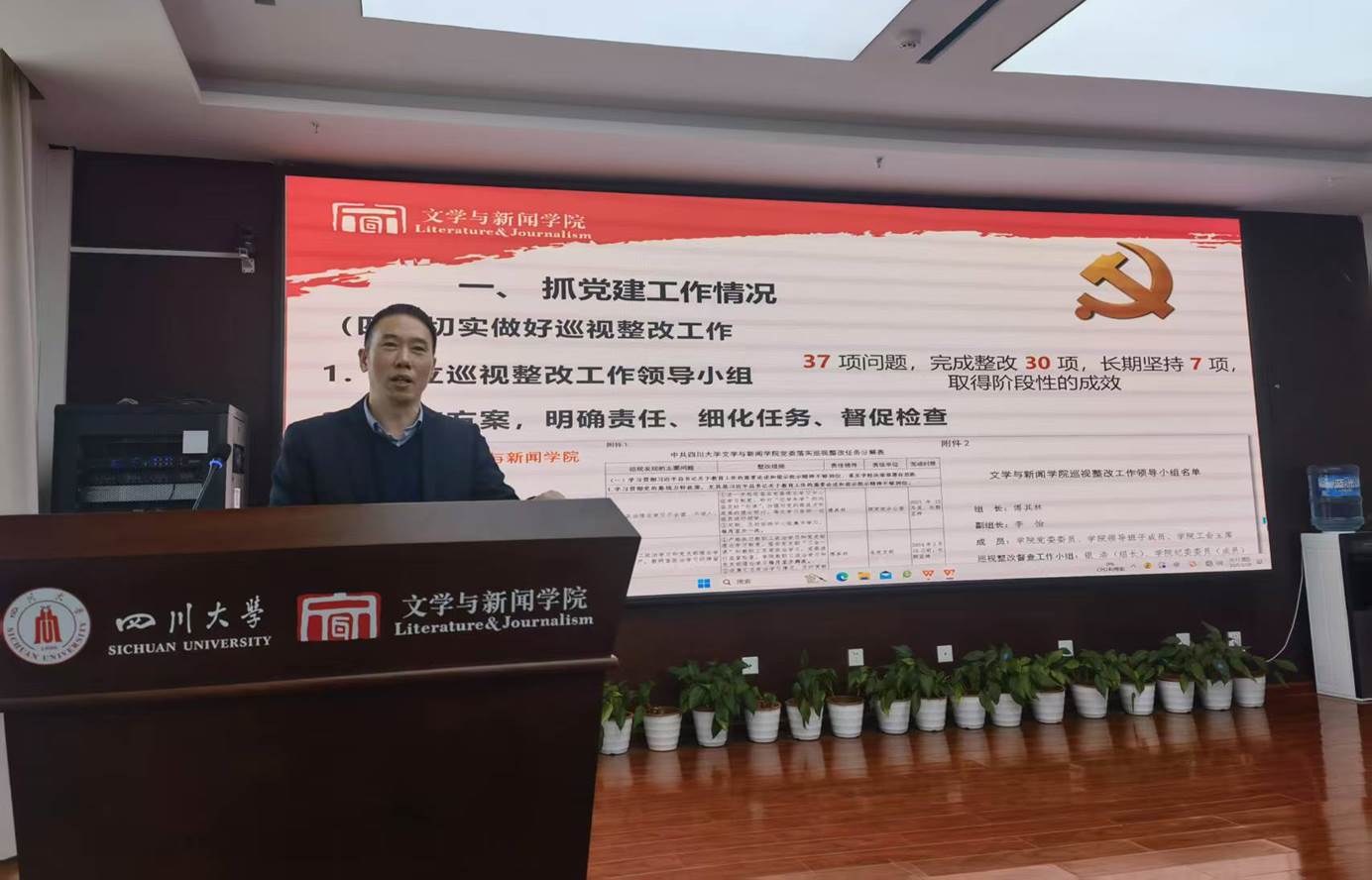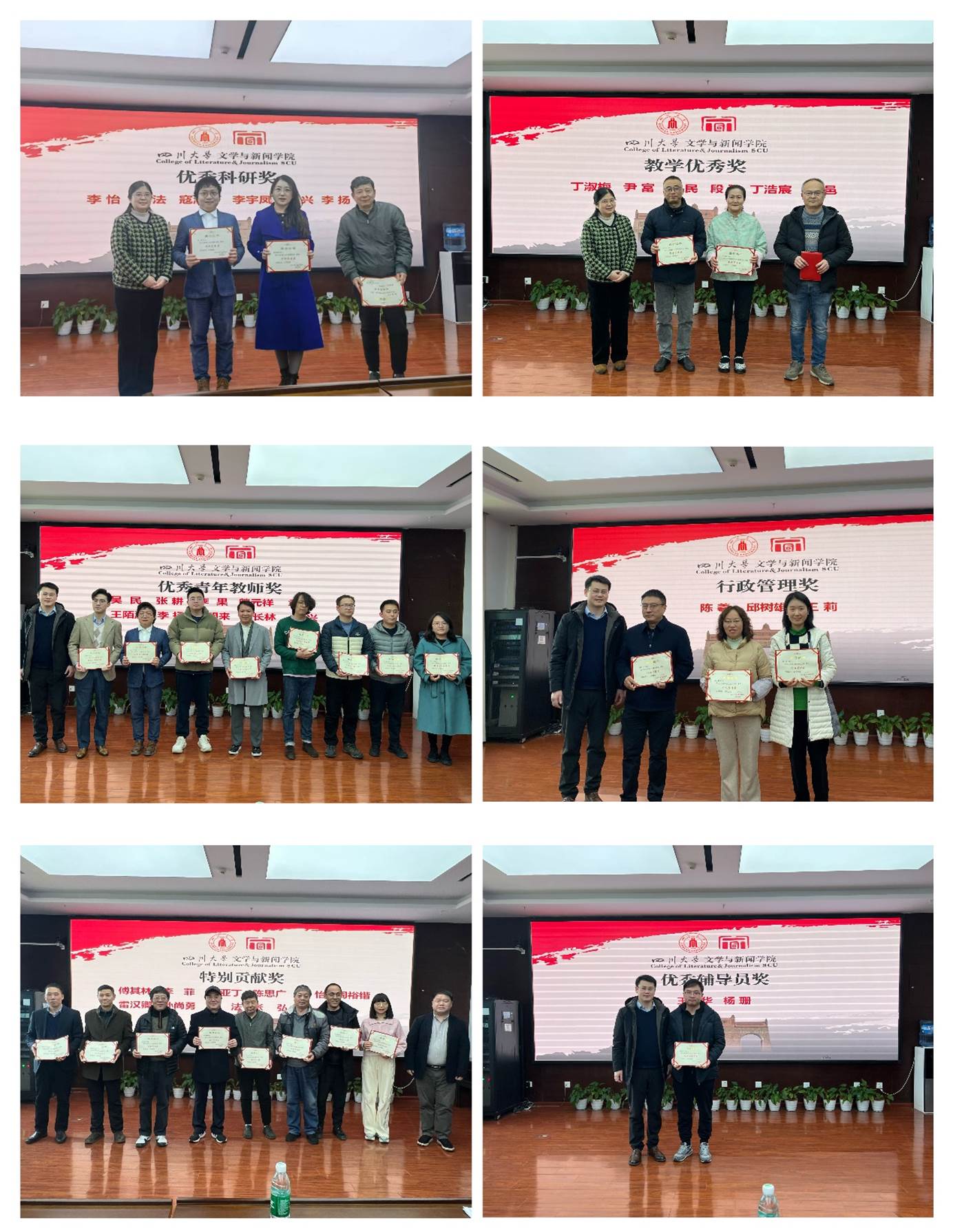 会议通报了学校关于罗鹭教授担任w88win体育官网(新闻学院、出版学院)院长的任职通知,并进行了学院2024年度工作表彰,为优秀科研奖、教学优秀奖、优秀青年教师奖、行政管理奖、特别贡献奖、优秀辅导员奖获奖教师进行颁奖。此外,傅其林书记还通报了2024年专业技术职务聘任结果、科级干部换届调整结果与绩效发放相关情况,并对新进教职工进行介绍。