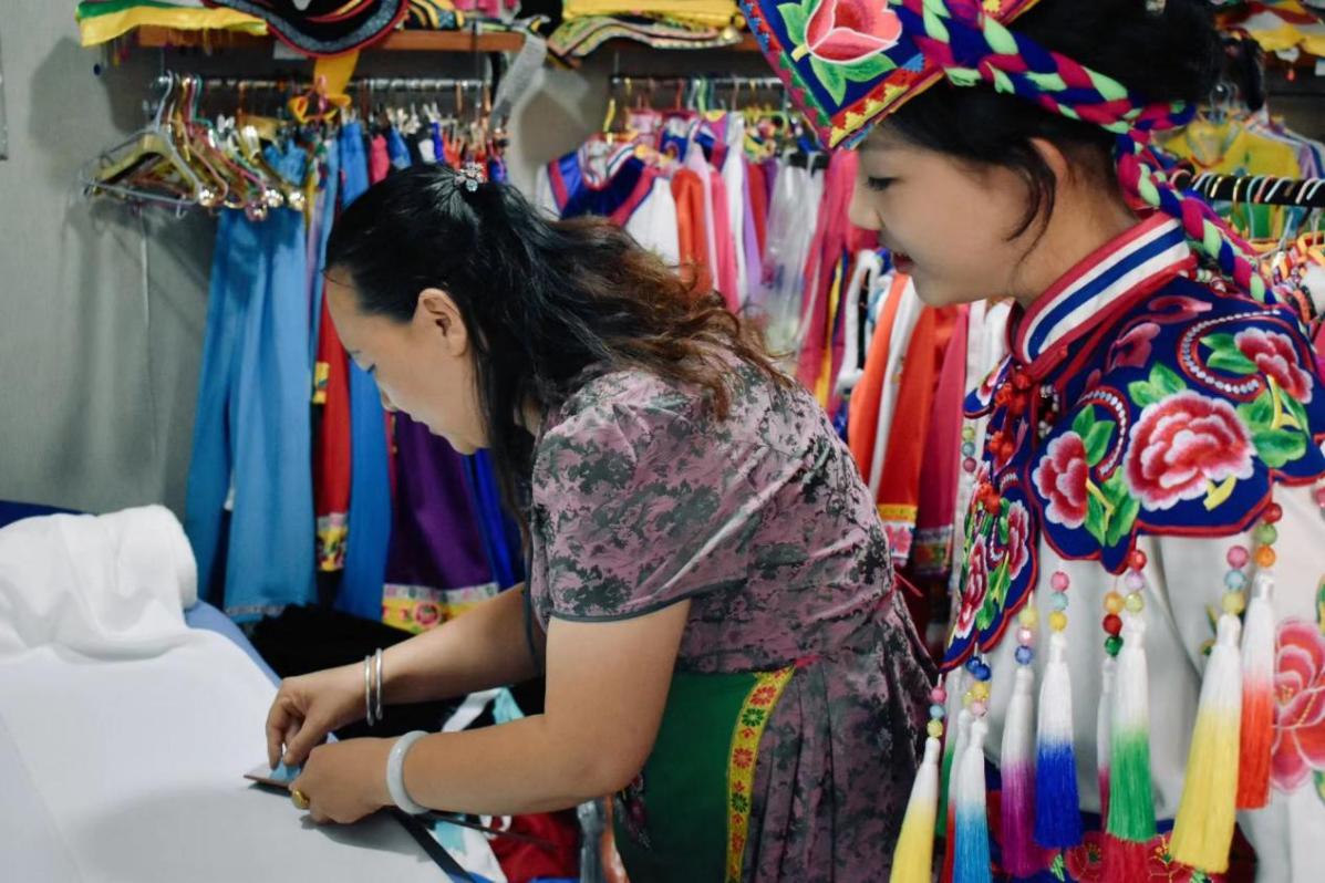 羌族民族服装店店主展示传统制衣技术