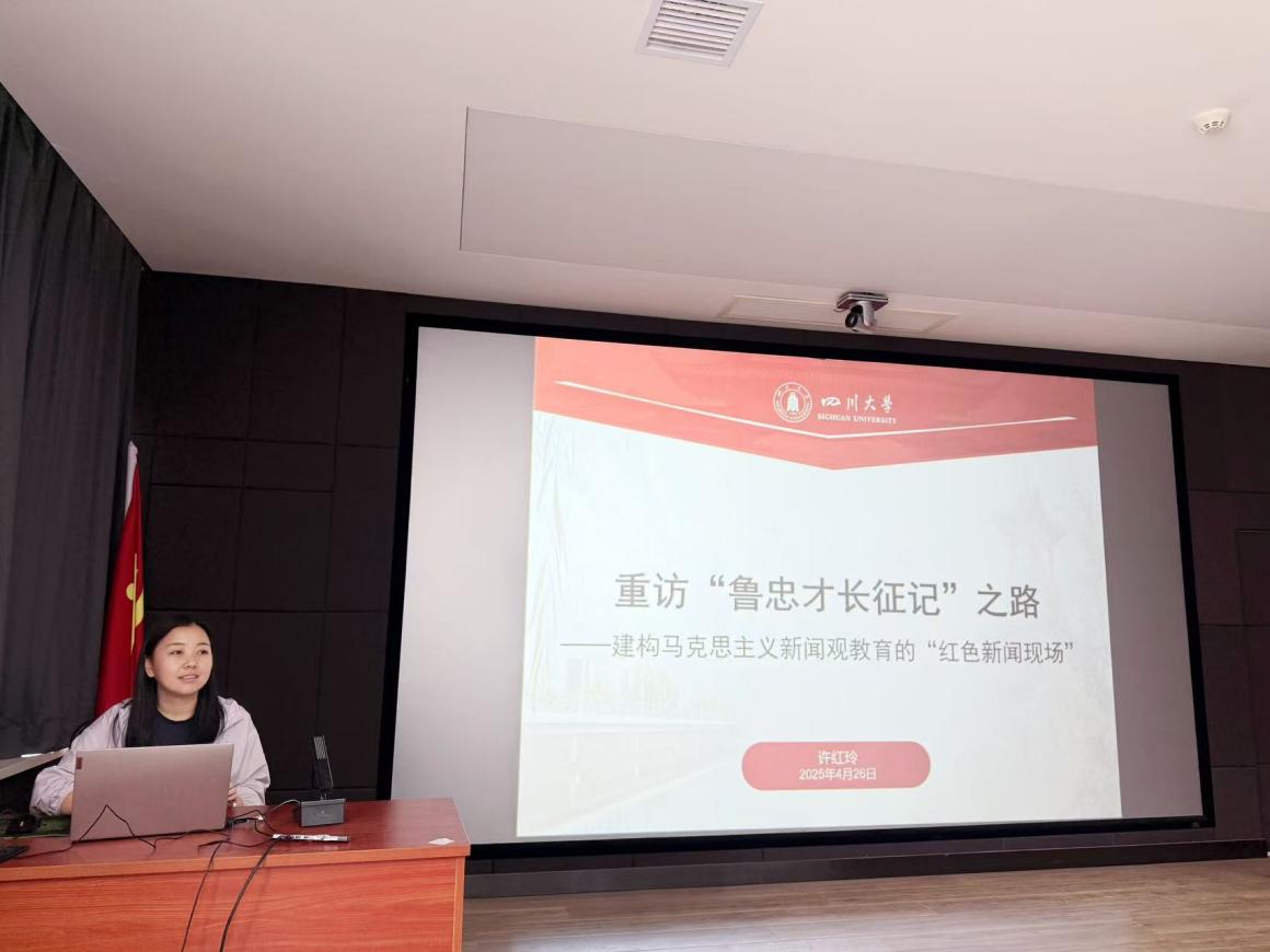 w88win体育官网博士生许红玲以“重访‘鲁忠才长征记’之路——建构马克思主义新闻观教育的‘红色新闻现场’”为主题作了汇报交流。她以1941年《解放日报》刊载的经典调查报告为切入点,通过实地重走陕甘宁边区运盐调研路线的田野实践,还原了《鲁忠才长征记》的创作背景。她在报告时指出,毛泽东同志推崇的“简洁文风”与“扎实调研”作风,正是当代新闻工作者践行马克思主义新闻观的历史镜鉴。她提出,将红色新闻遗址转化为教育现场,以“行走的课堂”推动马克思主义新闻观教育与党史、地方实践相结合,是创新人才培养的重要载体。