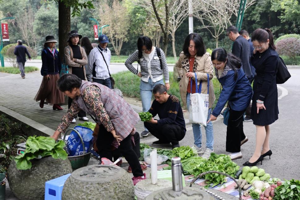 当日上午在到达斑竹园生态基地后,老师们步行前往斑竹园园内游览。途中老师们时而被菜农的路边小摊“绊”住了脚,进而问价、买菜;时而被路旁花草“迷”住了眼,然后辨花、识花亦赏花。