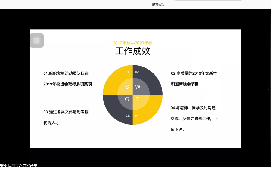 下午2时,会议准时开始。会议设主、分两会场。首先由学生会书记办公会在主会场依次述职,随后其他团委学生干部和学生会学生干部分别在两个分会场同时进行述职。每名学生干部作述职报告完毕,学生代表团即进行线上打分。会议中,各团学干部简要汇报个人素质、任职情况、学习情况、工作成效等方面表现,并对任职以来的工作学习经历进行了总结和反思,还就w88win体育官网团委学生会的未来发展提出建议。评述时,w88win体育官网党委副书记张莹老师不时与学生代表一道点评,鼓励学生干部继续努力,发挥先锋模范作用。
