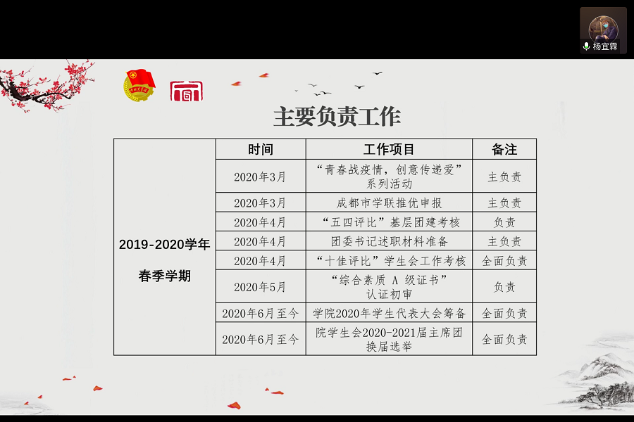 w88win体育官网学生会主席杨宜霖汇报主要负责工作