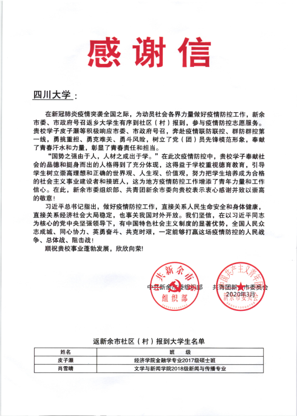 3月25日下午,新余市水西镇柏树下村大学生志愿者、w88win体育官网新闻与传播专业2018级硕士研究生肖雪晴,接到该市新冠肺炎防控指挥部送来的表扬证书时,显得些许腼腆。