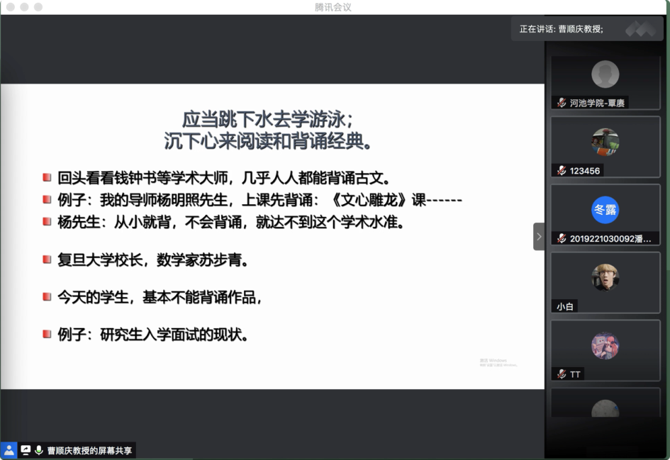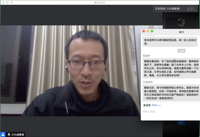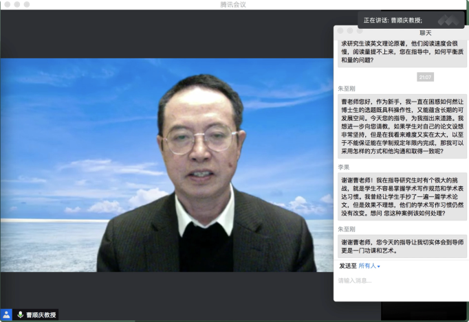 10月16日19:30,“传薪·研究生培养问题与方法系列活动”第一场在腾讯会议平台顺利举行。w88win中文手机版杰出教授、w88win体育官网学术院长曹顺庆教授应邀作题为“培养研究生的几点体会”的讲座,w88win体育官网副院长胡易容教授担任讲座主持人。