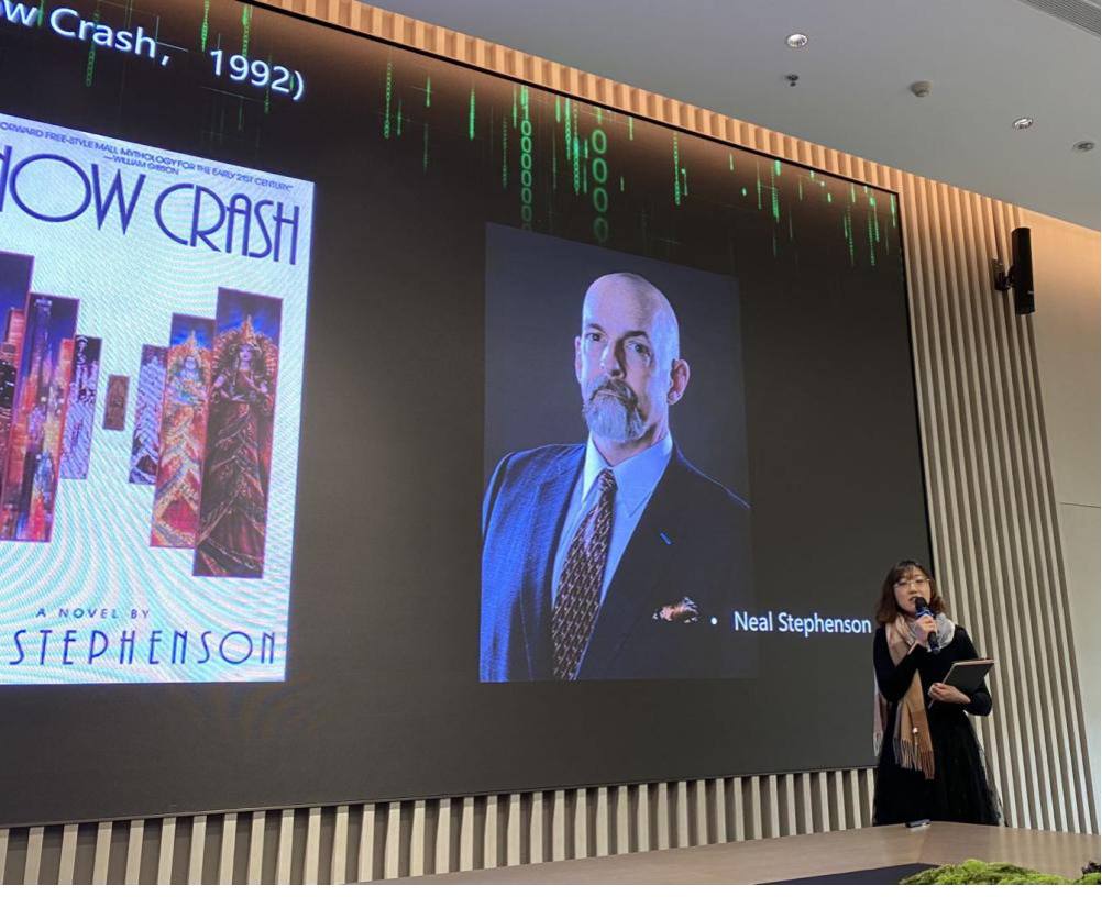 主讲人姜佑怡演讲的主题是《当我们谈元宇宙时,我们在谈什么》。她抛弃程式化的叙述框架,以漫谈的形式巧妙地衔接。姜佑怡谈到,“元宇宙”的前世应追溯科幻小说《雪崩》(Snow Crash),里面并不起眼的“metaverse”这一概念现在已经被技术资本重新挖掘、挪用与再阐释,从而拥有了新的内涵。信息化时代,没有人能够在“悬置的怀疑”中明哲保身,而必须躬身入局,思考“元宇宙”的意涵。姜佑怡揭示了“元宇宙”的实质是“对物理世界的信息升维”,随着技术的发展,隔在人与虚拟世界之间的“黑镜”(black mirror)将被逐步抽离,即将会诞生多种接入元宇宙的路径,而那些在前元宇宙时代被隐藏在界面背后的信息,也会更加广泛深入地渗透到我们的生活之中。在这种情况下,如何主动地从中筛选和获取有效信息,或许将成为每个人个体人格完善所必要的学习和训练的内容。