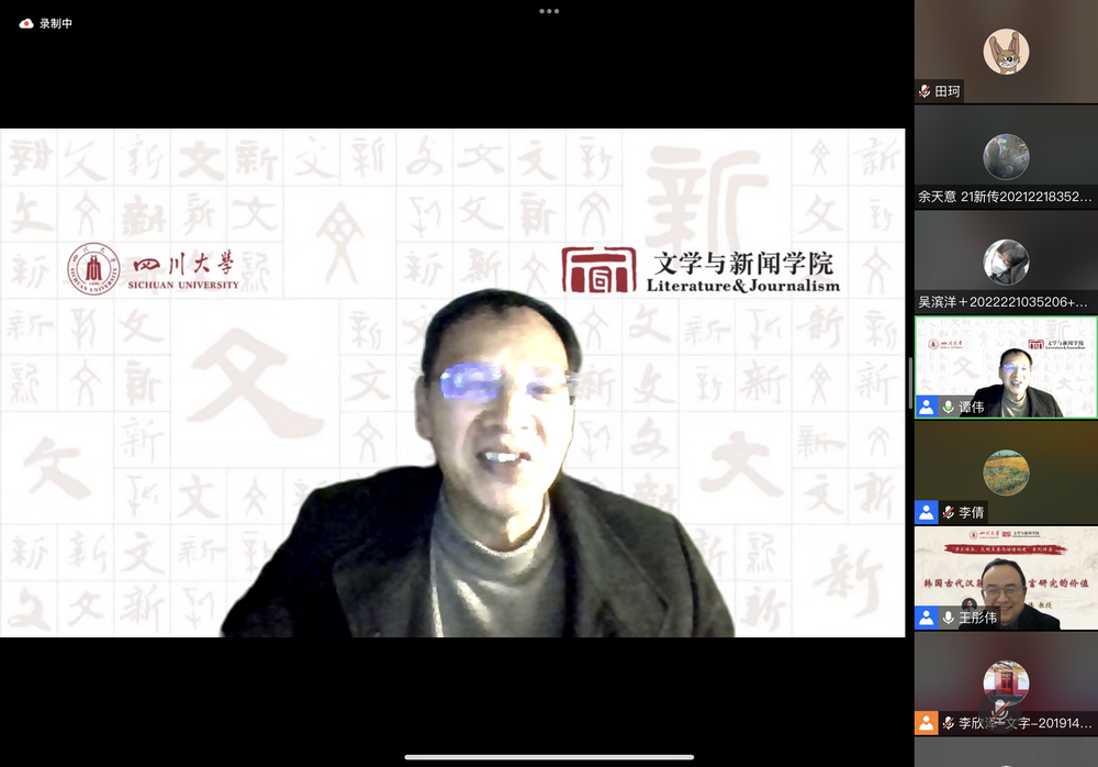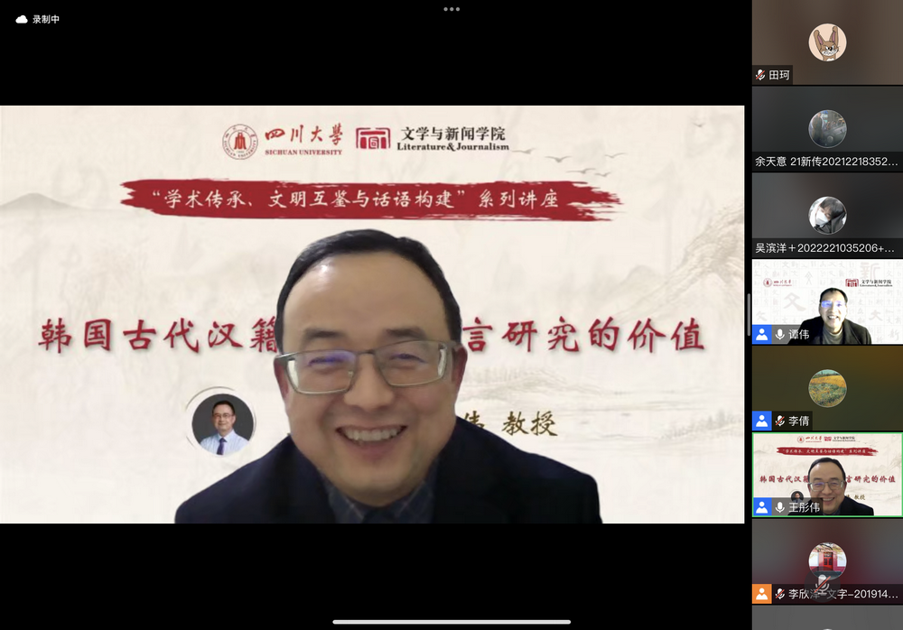 2023年2月24日,w88win体育官网主办的“学术传承、文明互鉴与话语构建”系列讲座第二讲在线上顺利举行。w88win体育官网教授,中国俗文化研究所教授,博士生导师,w88win中文手机版人事处副处长兼青年教师与专职科研队伍管理办公室主任,四川省传统文化社科普及基地副主任王彤伟教授作了“韩国古代汉籍文献及语言研究价值”的主题讲座。讲座由w88win体育官网谭伟教授主持,校内外师生近200人参与。