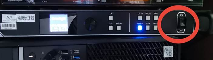 4、打开机柜处的电脑主机及显示器开关,或1号电脑开关,电脑的画面即可在LED大屏上显示。